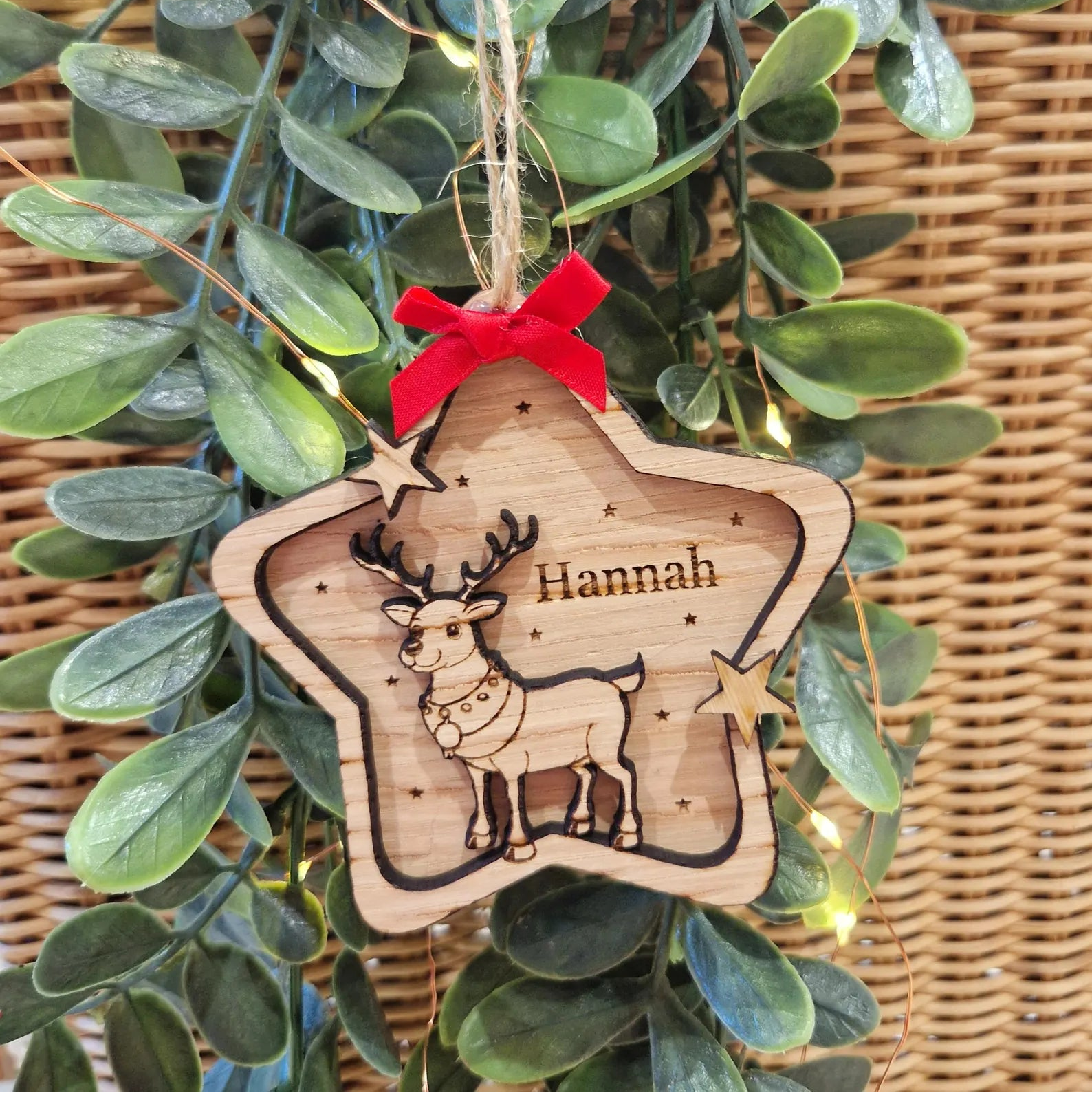 Each star is carefully laser cut from natural wood and beautifully layered to create a charming 3D effect, bringing a touch of storybook whimsy to your tree. Choose from three delightful designs — Santa, Reindeer, or Snowman — and personalise it with a name to make it truly your own.
