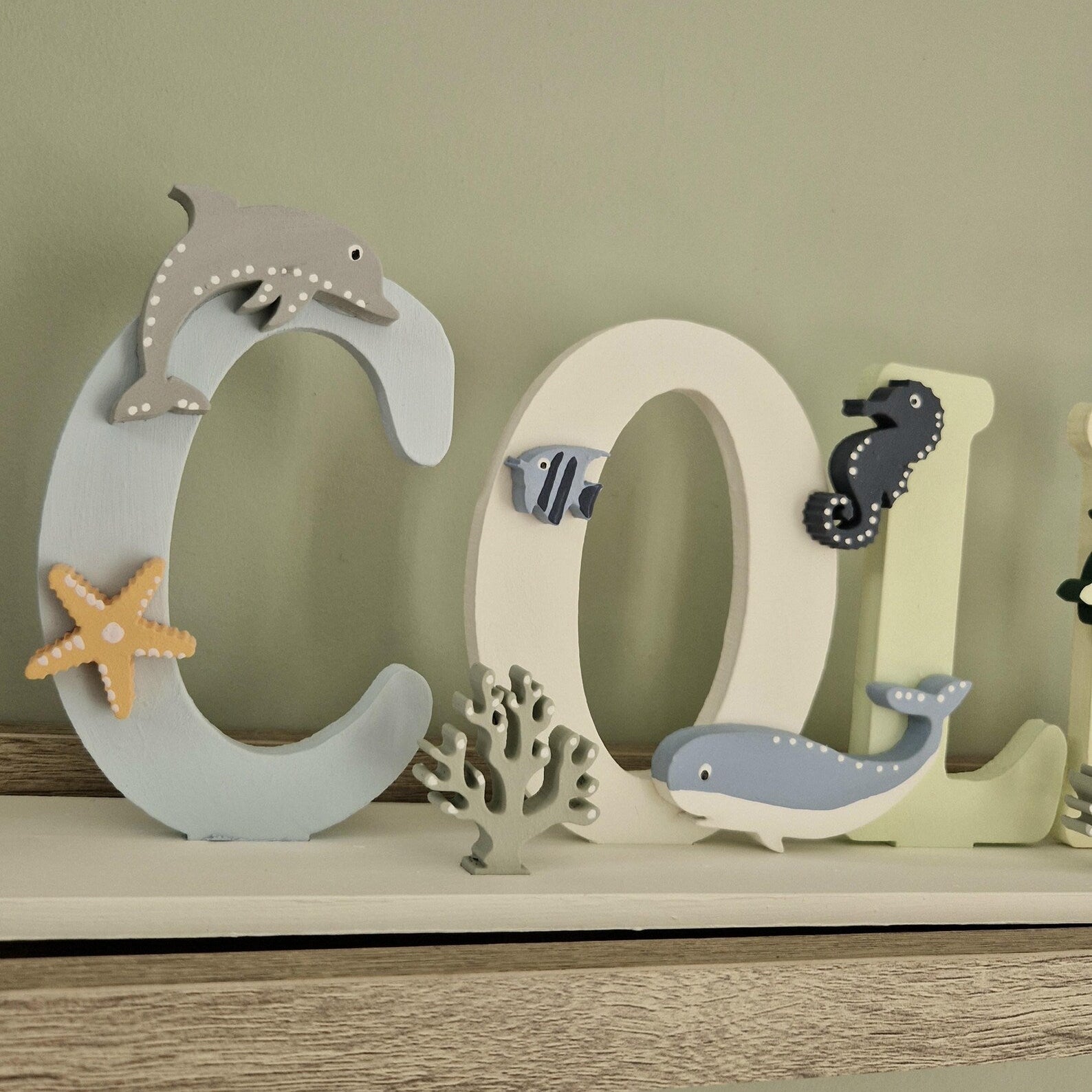 Each letter stands approximately 12cm tall and is carefully laser cut from sturdy 6mm MDF, ensuring a smooth, high-quality finish. Designed to bring the ocean to life, the letters are cut in a playful sea theme and decorated with charming sea creatures including a sweet whale, playful dolphin, cheerful crab, and delicate seahorse.